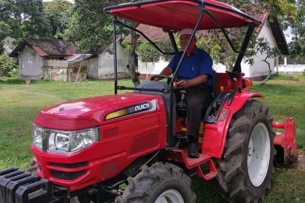 Drs. Saipullah selaku Waka HUMAS SMKN 1 Kotaraja mencoba menaiki traktor disela-sela praktek siswa kelas 12 ATPH dan ATP untuk mempersiapkan UKK ( ujian kompetensi keahlian ) yang sekiranya digelar pa