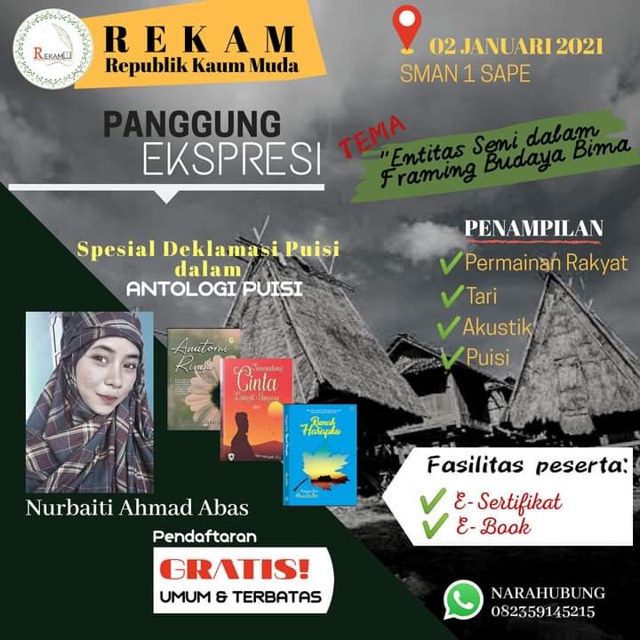 panggung ekspresi diadakan untuk memotivasi kembali semangat para pemuda dan pelajar di kecamatan sape dalam berliterasi dan berkesenian. daam kegiatan ini pemuda dan pelajar sape berkesempatan menuan