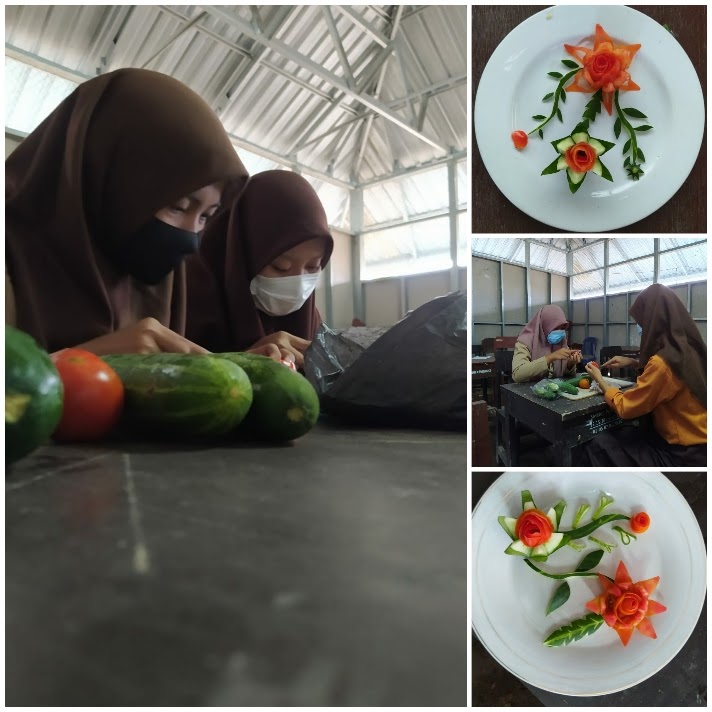 Pada praktek kali ini, para siswa diajarkan membuat Garnish yang nantinya bisa dijadikan hiasan dan menambah nilai jual makanan atau minuman yg dibuat.