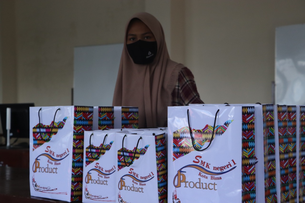 Para siswa Kompetensi Keahlian Desain Komnikasi Visual (DKV) SMK Negeri 1 Kota Bima mendisain dan membuat Paper Bag dengan logo "SMK Negeri 1 Kota Bima Product". Paper bag yang terbuat dari kertas ini